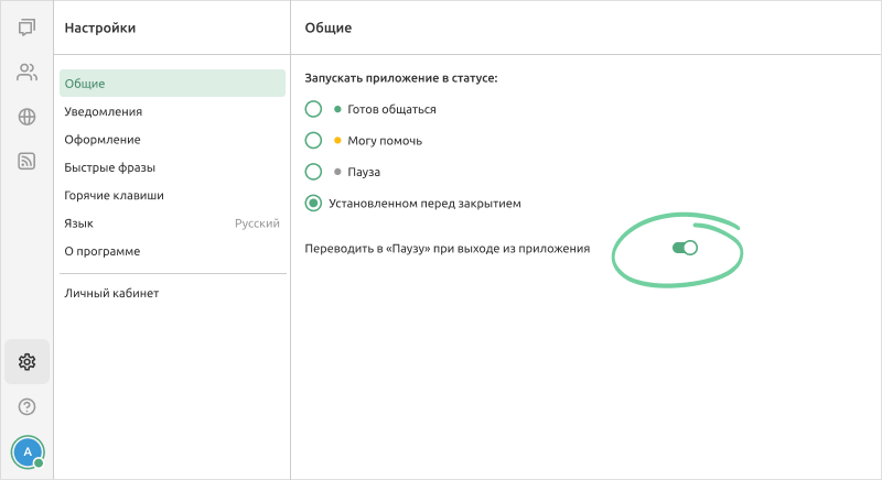 Включите эту опцию, чтобы, например, по завершении рабочего дня просто закрыть приложение Пульта, автоматически перейти в офлайн и не принимать диалоги. Ваше мобильное приложение также перейдет в Паузу. Т.е. в таком сценарии оно будет служить скорее для подстраховки в течение рабочего дня, если вы, например, отошли от компьютера за кофе.