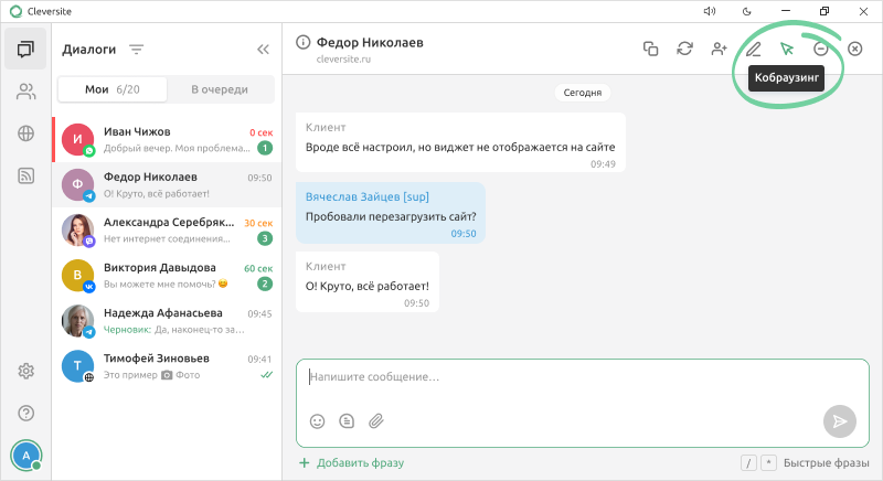 Пересылайте друг другу сообщения клиентов, добавляйте в чат с клиентом более опытных коллег или сотрудников других отделов, переключайте диалог на другого оператора - пользуйтесь всеми возможностями Cleversite, чтобы получать максимум!