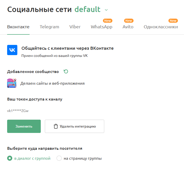 Для настройки интеграции перейдите в раздел Управление - Социальные сети, выберите нужную соцсеть или мессенджер и настройте интеграцию.