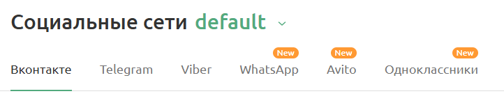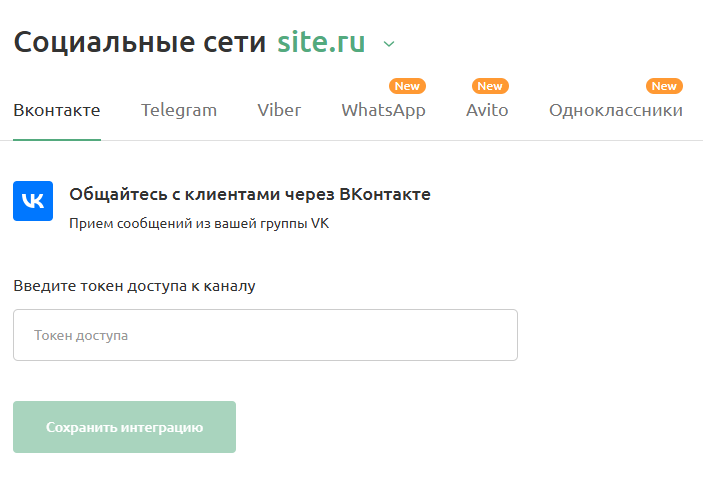 Например, если на сайте “default” для VK у вас уже есть интеграция, можете добавить еще одну интеграцию с VK для сайта “site.ru”.