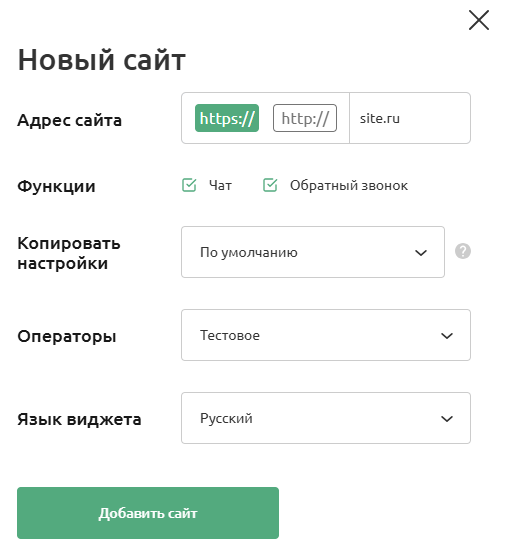 Для этого в разделе Управление - Сайты нажмите на кнопку “Добавить сайт” и в названии укажите “site.ru”, выберите оператора/операторов и добавьте к сайту, чтобы они смогли принимать обращения из второй интеграции.