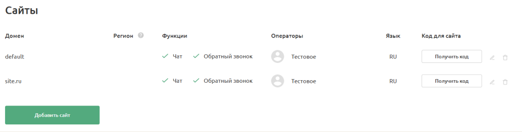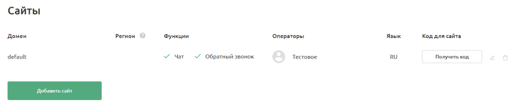 Изначально в нашей системе все интеграции привязываются к сайту. Поэтому после регистрации в личном кабинете в разделе Управление - Сайты, по умолчанию будет указан сайт “default”. Т.к. у вас нет реального сайта и вы не будете на нем размещать виджет, данное поле можно рассматривать в качестве названия проекта и указать любое название.