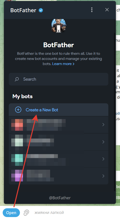 - 1Откройте в телеграм @BotFather, нажмите кнопку Open → Create new bot или отправьте команду /newbot