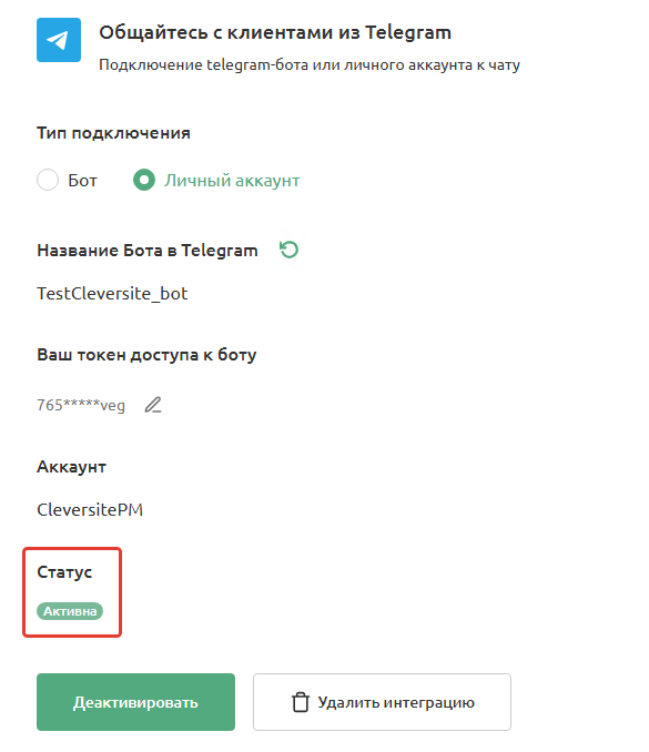 - 8При успешном подключении вы увидите соответствующий статус интеграции.