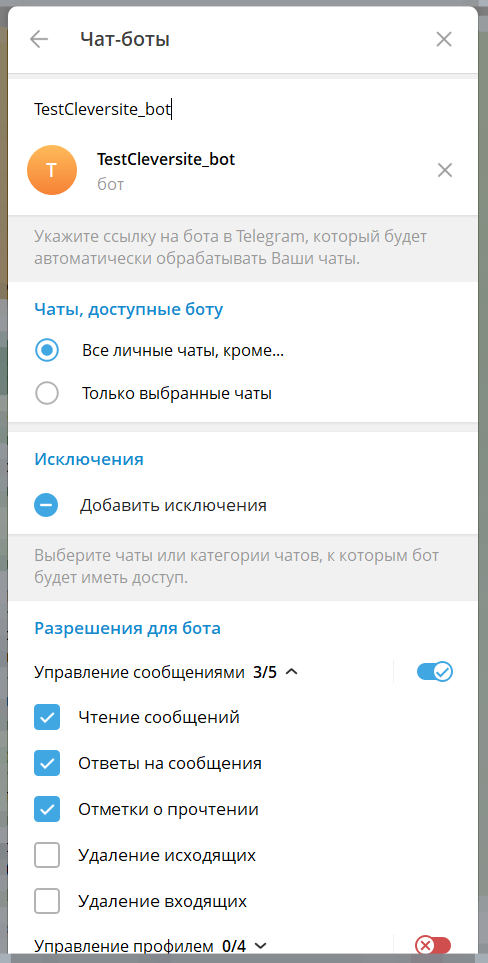 - При необходимости, в пункте «Чаты, доступные боту» вы можете ограничить чаты, которые бот будет обрабатывать и присылать в Cleversite.