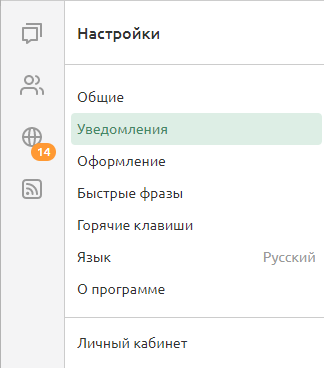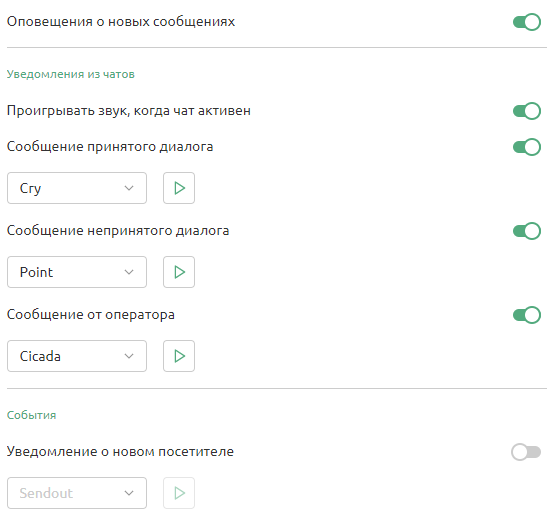 - 2После чего появится возможность настроить звуки уведомлений из чатов и о новых посетителях.